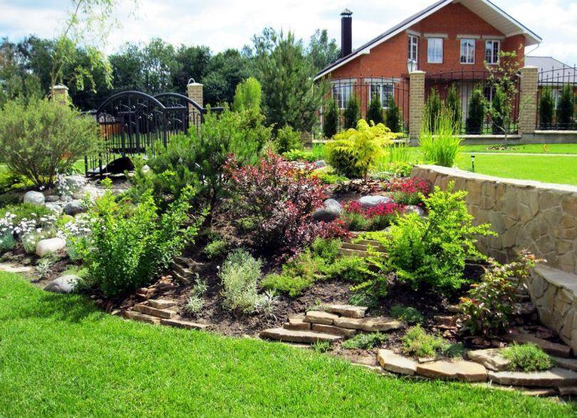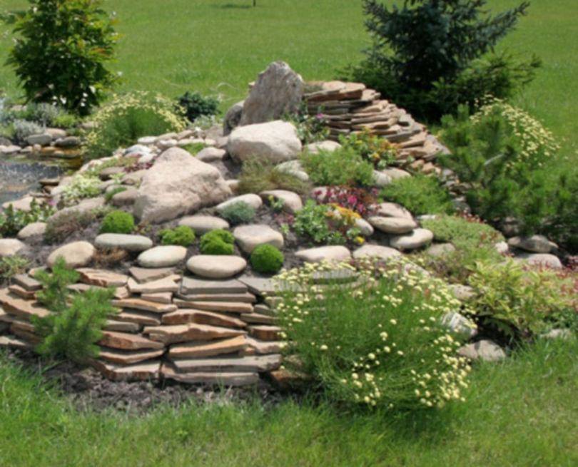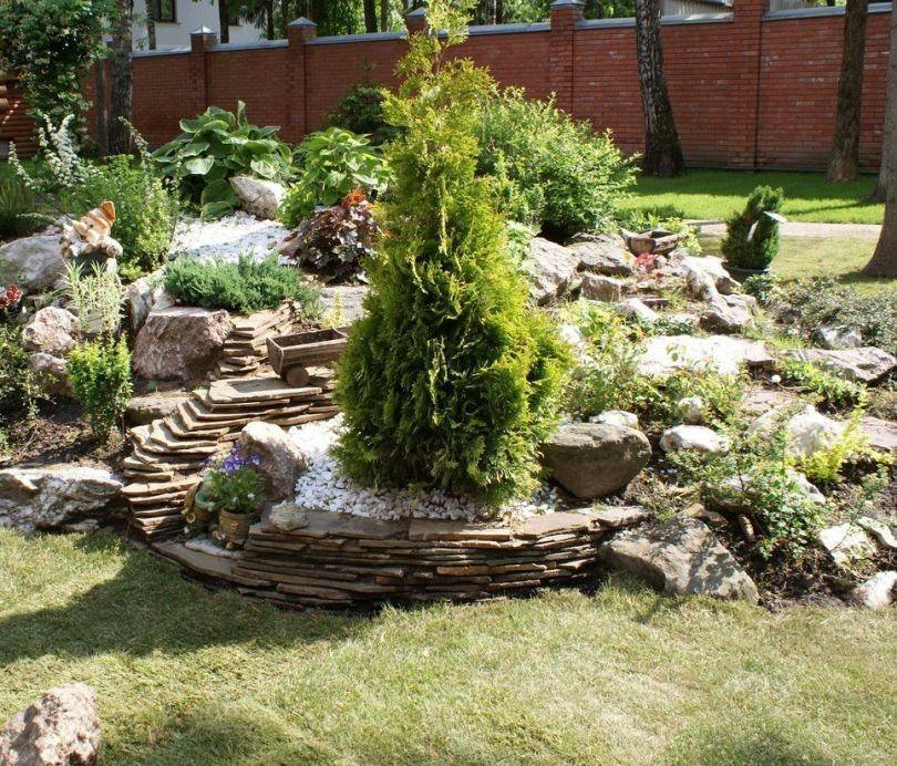 Этот вариант альпийской горки идеален для просторных участков. Особенности его строительства: