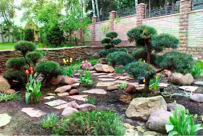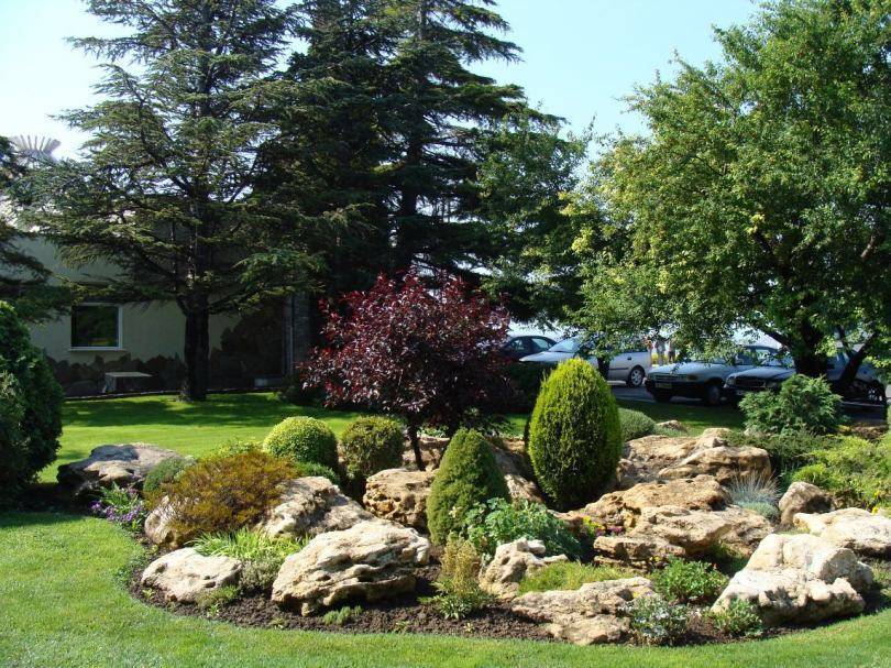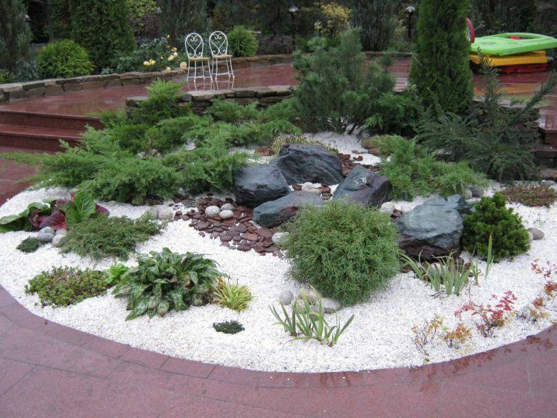 Участие булыжников и крупных морских камней в дизайне альпийской горки помогает сделать необычные клумбы для декоративных насаждений. Хвойные кустовые растения очень напоминают парк миниатюрных деревьев.