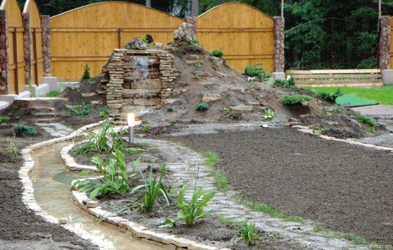 В горке с водопадом или фонтаном всё должно смотреться очень естественно. Самый распространённый вариант композиции — возвышение, созданное из трёх совмещённых ярусов, дополненное ручьём.