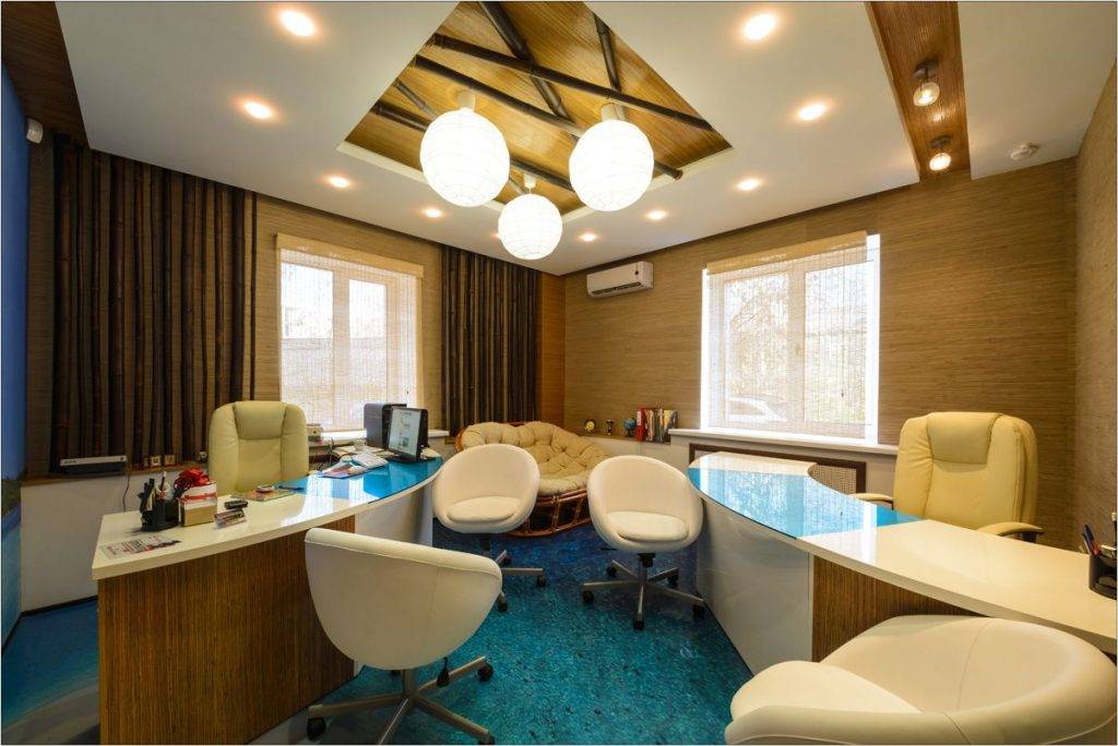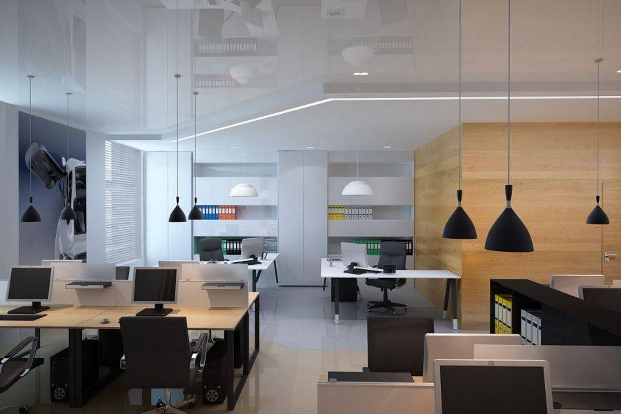 Как отмечалось выше, освещение при создании дизайна оформления офисного помещения играет одну из главных ролей. Все кабинеты или рабочие места, если это студия, должны быть оформлены в едином стиле. То же относится и к освещению. Во-первых, нужно четко рассчитать количество сотрудников, которые будут одновременно находиться в помещении. Стильные решения интерьера создаются благодаря правильному задействованию света и цвета. Стоит посмотреть, как обыгрываются различные зоны в комнате на фото, которых сейчас представлено огромное количество, и становится понятно, что один и тот же интерьер с различным световым решением будет приобретать различные звучания.