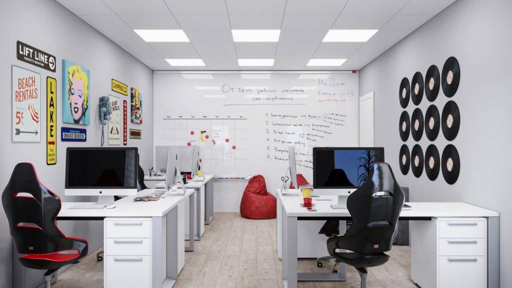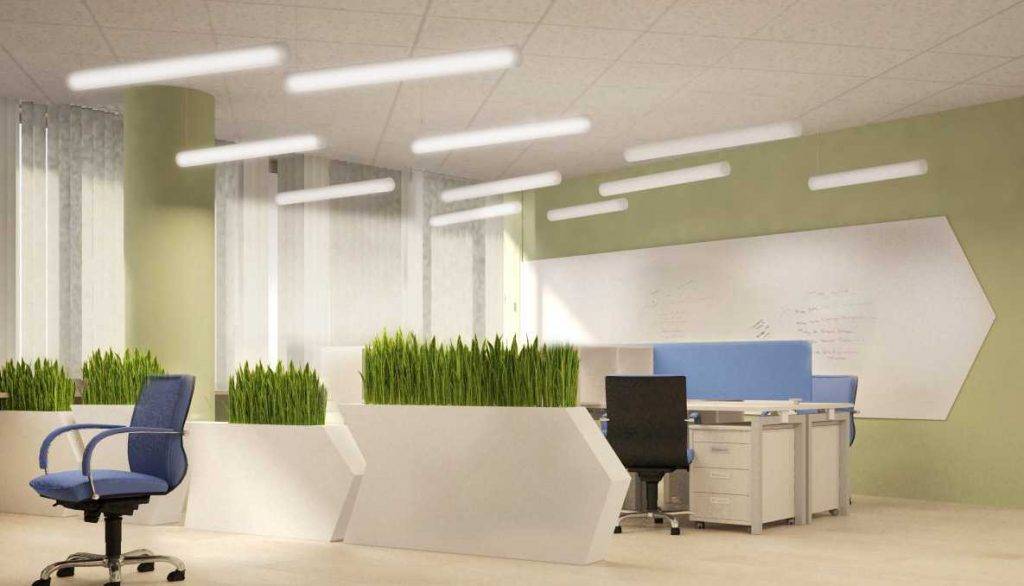 Если офис оформлен теплой гаммой оттенков, то присутствие здесь холодного освещения – это огромная ошибка. Использование того или иного вида освещения напрямую зависит от вида деятельности фирмы. Так, для заводского офиса лучшим решением будет голубоватое освещение в сочетании с холодным оттенком стен. Это подчеркнет строгость обстановки и выработает дисциплину. Творческая атмосфера достигается использованием теплых тонов в освещении и интерьере.