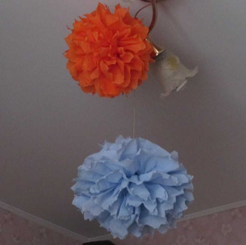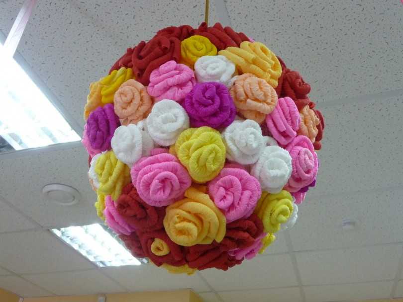 Теперь приклеиваем готовые цветочки к полностью высушенному воздушному шару примерно до половины. Если вам кажется, что цветочков слишком много, то просто плотней приклеивайте их друг к другу, если же, наоборот, слишком мало – нарежьте новых или приклеивайте реже. Оставляем шар с салфетками до полного высыхания.