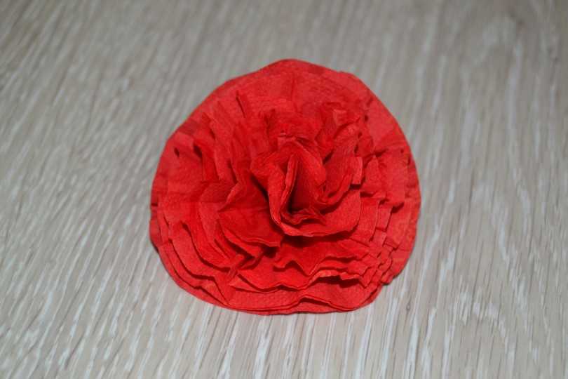 Бутоны гвоздик делают из салфеток, которые два раза сворачивают пополам. Получившийся квадратик по центру фиксируют при помощи степлера. Фигурные ножницами вырезают круг. Каждый слой фигуры аккуратно приподнимают и прижимают к центру, не затрагивает последние 2−3 слоя. Таким образом, надо изготовить 4 красных и 6 белых бутонов. Перед формированием цветков у трёх белых заготовок края обводят красным фломастером, чтобы получилась красивая окантовка.