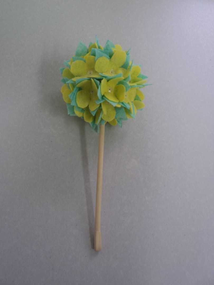 Для того, чтобы получить полноценную фигурку цветка, которую можно будет поставить на стол, необходимо по центру салфетки (там же где скобы), вставить проволоку (можно зубочистку), обёрнутую бумагой. Края обрабатываются с помощью зубочисток, создавая небольшие треугольники. Слои салфетки надо загнуть не только вверх, но и вниз, чтобы получился объёмный шарик. Таких цветков можно сделать довольно большое количество, чтобы букет выглядел пышным и правдоподобным.