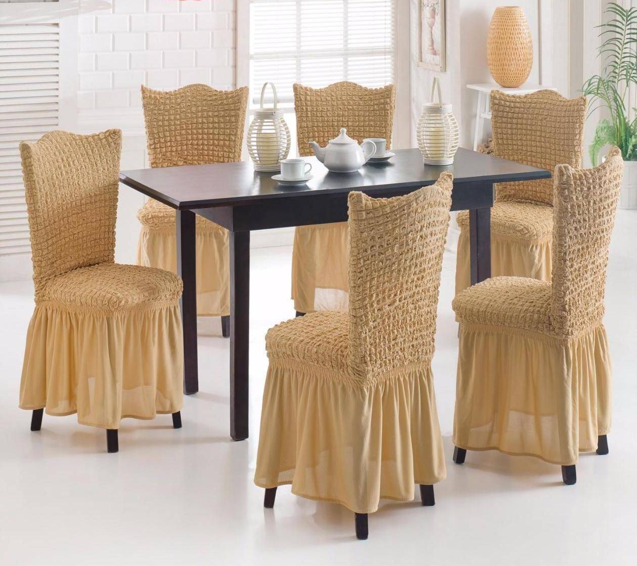 Модели для стульев выпускаются в универсальном варианте – из эластичного материала. Обычно растяжимость изделий – от 40 до 60 см. Такие еврочехлы подходят для большинства стульев.