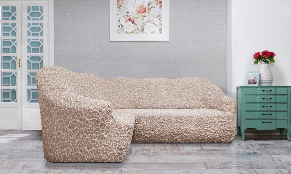 - для угловых диванов. Накидки делятся на левосторонние и правосторонние, в зависимости от направления стороны угла. Их длина выбирается согласно количеству посадочных мест. Как правило, они достигают 5 метров в длину. При их покупке измеряется не только ширина и высота спинки, но и выступы;