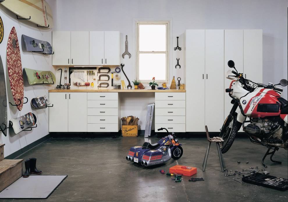 Предположим, что имеется небольшое гаражное помещение. Чтобы оно не было слишком тесным, приходится продумывать разные варианты расстановки гарнитура. Для этого используются металлические или деревянные стеллажи. В некоторых случаях в потолке устанавливаются специальные кронштейны, которые надежно будут удерживать легкий транспорт: велосипед, гироскутер.