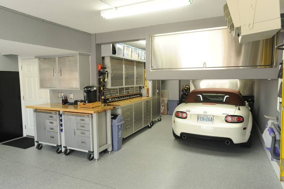 просторный гараж обустроен подвесной мебелью и автоматическими воротами