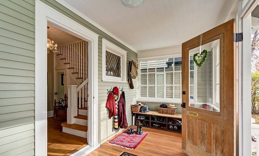 Вошедшие в моду стеклянные двери и большие окна превращают прихожую в светлую веранду. Нужно учесть, что при таком подходе требуется адекватный экстерьер – участок перед фасадом дома и дорожки к нему должны быть облицованы и изолированы от газона.