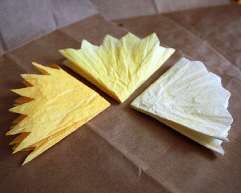 Для него используют гофрированную цветную бумагу. Если ее нет, подойдут салфетки нужного цвета или туалетная бумага без тисненого рисунка. Мягкий материал легко гофрируется, хорошо держит форму. Для получения складок бумагу сбрызгивают водой, накручиваю на карандаш, сжимают с разных сторон. Когда салфетка или туалетная бумага немного подсохнет, ее расправляют, она готова к работе. Для листиков подойдут любые оттенки от салатового до болотного.