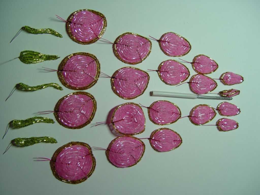 Половина лепестка собирается на нитку, идущую от бутона. Каждый следующий лепесток пришивается к предыдущему внахлест.