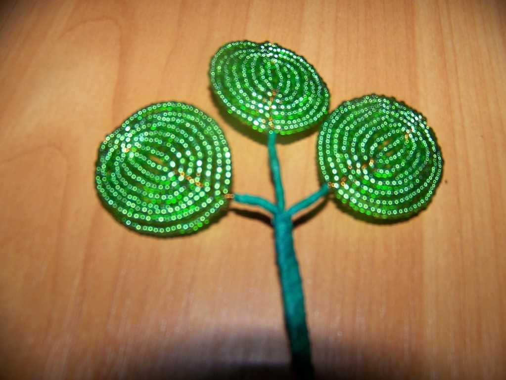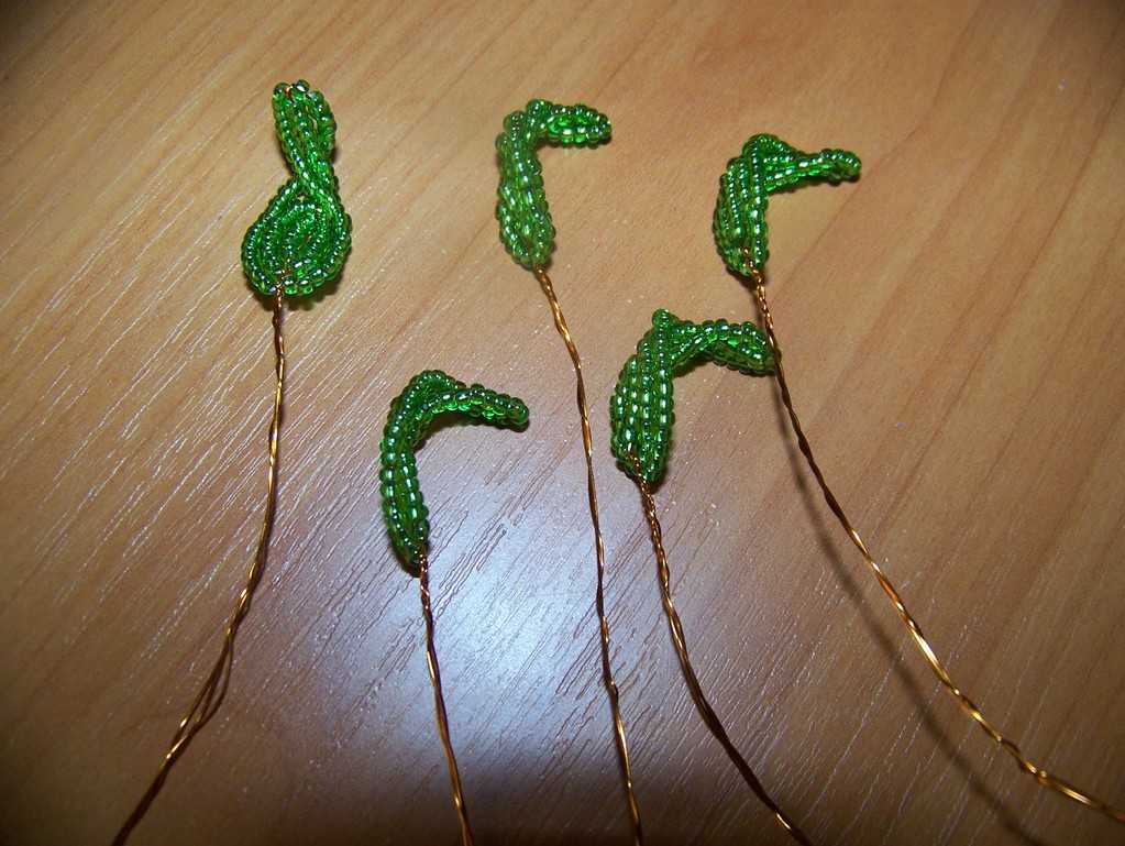 - По мере намотки на стебель ленты, приклеивайте предварительно приготовленные листья из бумаги зеленого цвета.