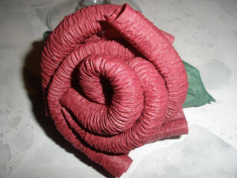 Дополнительно из зеленой бумаги вы можете вырезать и листья, но, если из сделанной розы вы будете собирать большую композицию, лучше оставить стебель без листьев.