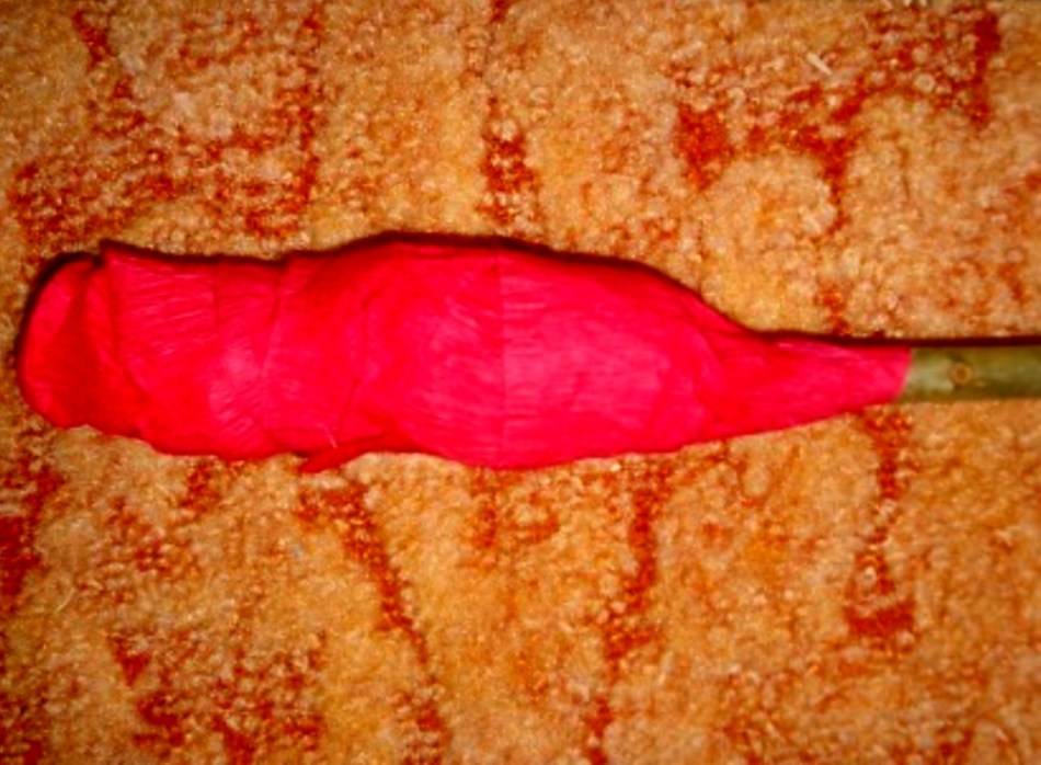 для наружного края – отдельные узкие лепестки. Бутон начинают формировать с середины, в центр при желании помещают небольшую полукруглую конфету в фольгированной упаковке. Затем добавляют наружные лепестки. Их фиксируют клеем, используя термопистолет. Еще один вариант – делать лепестки с длинным кончиком. Такие розы крепят на проволочный каркас. Кончики скручивают, около хвостика формируют чашелистик, затем стебель – обматывают проволоку бумагой.
