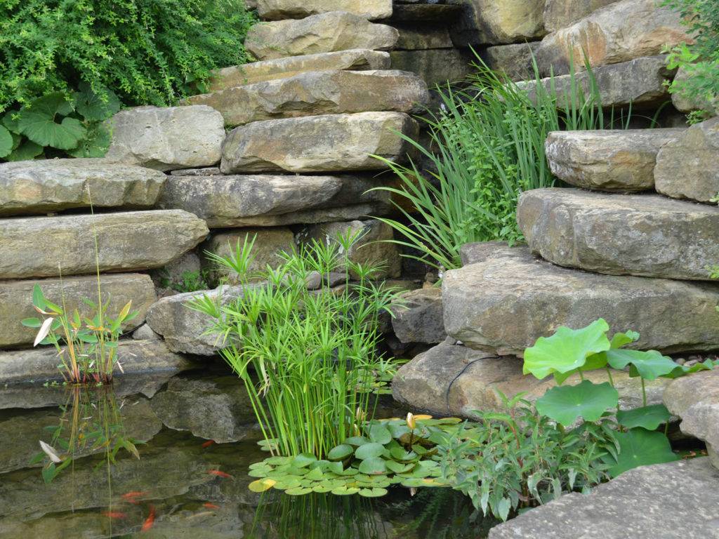 Альпинарий с водопадом и небольшим прудом рядом обычно устанавливается на газоне, поверх высаживается нецветущими многолетними растениями. Для обустройства водоема необходим насос и небольшой котлован.