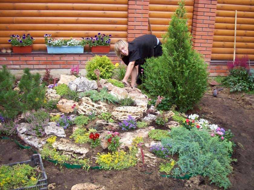 Даже при самостоятельном устройстве композиции, много денег тратится на карликовые деревья, каменные глыбы. Для экономии на даче, территории загородного дома можно создать имитацию горного пейзажа из подручных материалов. По периметру обрабатываемых полей выбирают камни, в лесу на лугах собирают семена душистых трав, из леса приносят кустики черники, брусники.