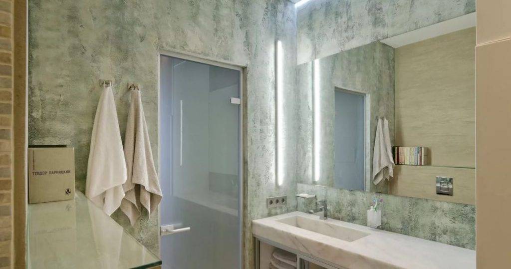 Также для отделки ванной можно использовать структурную штукатурку (короед, камешковая). В состав смеси входят минеральные компоненты в виде слюды, гранитных камушков, благодаря которым на поверхности можно сформировать характерный рельеф.