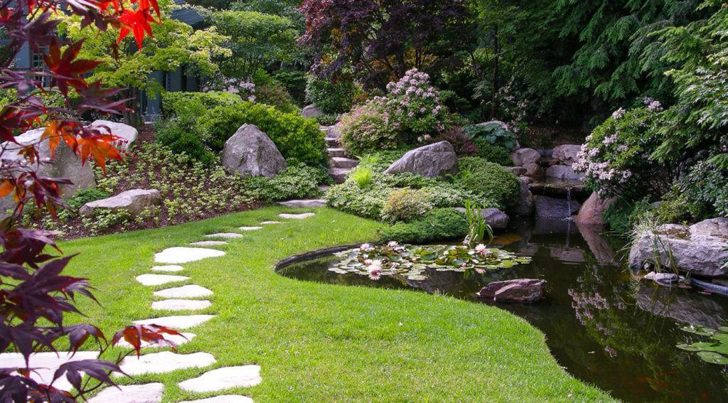 Но если озера рядом нет, то придётся на участке выкопать небольшой водоем. Возле пруда хорошо соорудить мостик, вокруг воды следует рассадить растения, идеально, если на водной глади будут плавать кувшинки. Традиционно для стиля, если вы посадите возле водоёма плакучую иву, а под ней поставите скамейку. Пейзаж вокруг водоёма можно дополнительно смягчить группами больших камней или различных кустов.