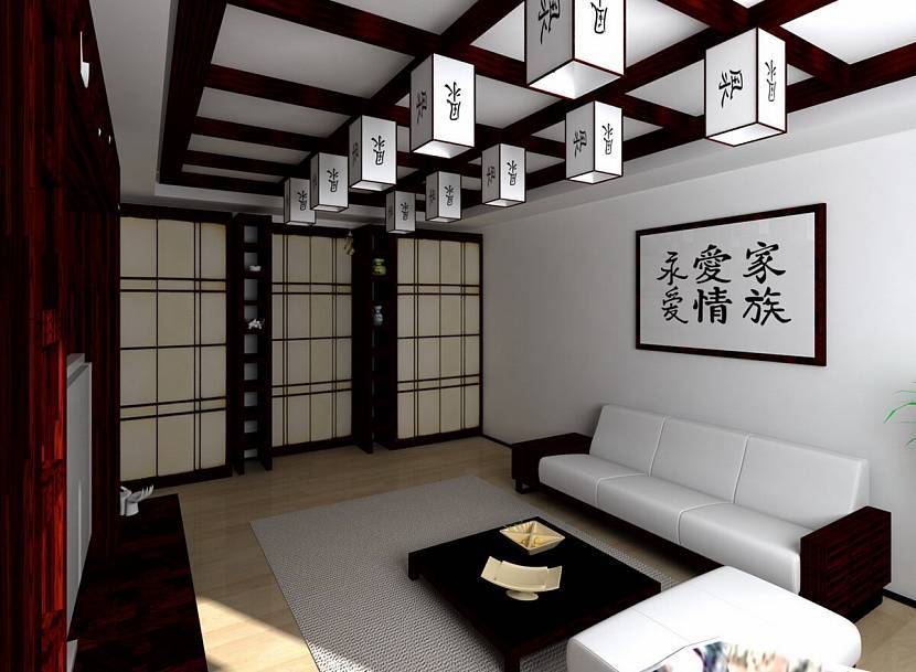 При оформлении потолка по японскому стилю важно сохранить простоту, строгость и лаконичность. Например, при использовании натяжного потолка, выбирают натяжное полотно мягких оттенков матовой фактуры