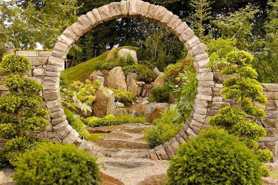Арка для растений в саду может быть выполнена из камня. Такие арки выглядят достаточно солидно и служат очень долго. Стоит понимать, что не стоит применять арки из данного материала в садах с простой стилистикой.
