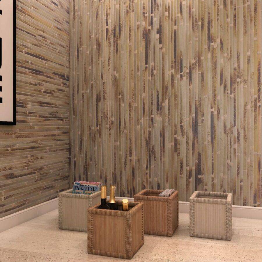 Панели. Их изготовляют из циновок. Изделия уместны для любого помещения. Они не боятся влаги, механических нагрузок, их рекомендовано использовать в ванных или саунах. Большие поверхности ими не следует – будет выглядеть слишком вызывающе.