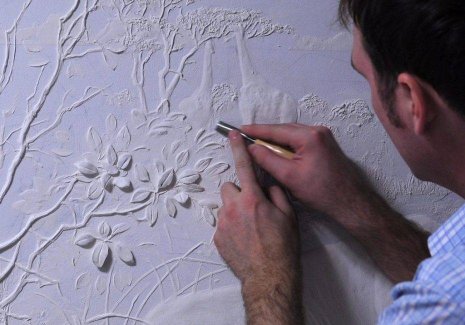 Настенный барельеф с крупными изображениями считается сложным процессом художественной лепки из гипса или других материалов. Для его создания можно применять несколько техник (свободное гипсование, приклеивание готовых деталей). После того как поверхность стен прогрунтована не менее двух раз, ей придают рельефность, используя для этого смятый полиэтилен, бумагу, валик и шпатель. Большие композиции могут быть представлены изображениями фигур человека, абстракции, птиц, деревьев и животных. Их переносят непосредственно на ранее подготовленную поверхность стен с помощью специальных трафаретов или копирки, можно также контуры рисунков обвести спичкой или зубочисткой.