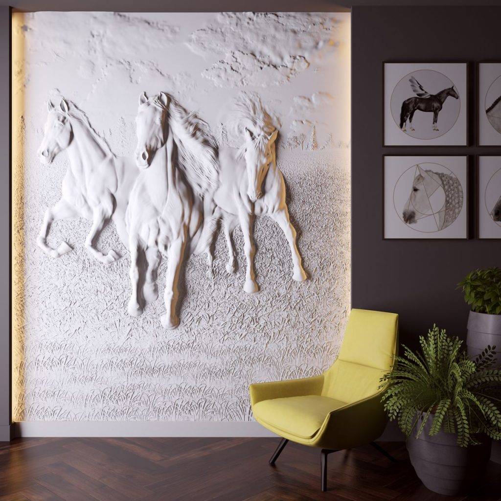 Сначала нужно продумать интерьер помещения, где будет находиться барельеф. Объемные изображения можно сделать в любой комнате, однако чаще всего их можно увидеть в гостиных и спальнях.