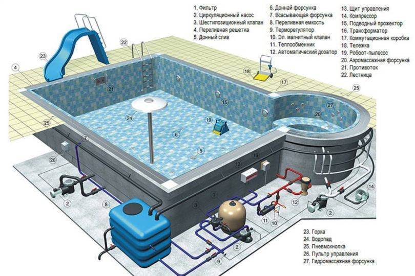 В нем обязательно должны быть насосы. Их количество зависит от того насколько система сложная, а также от объема воды. Для того чтобы конструкция нормально работала и обслуживалась, она должны быть оборудована насосом для перекачки воды. Он необходим для наполнения водоема, для сливания в случае ремонта, консервации на зиму и очищения. Должен быть и циркуляционный насос.