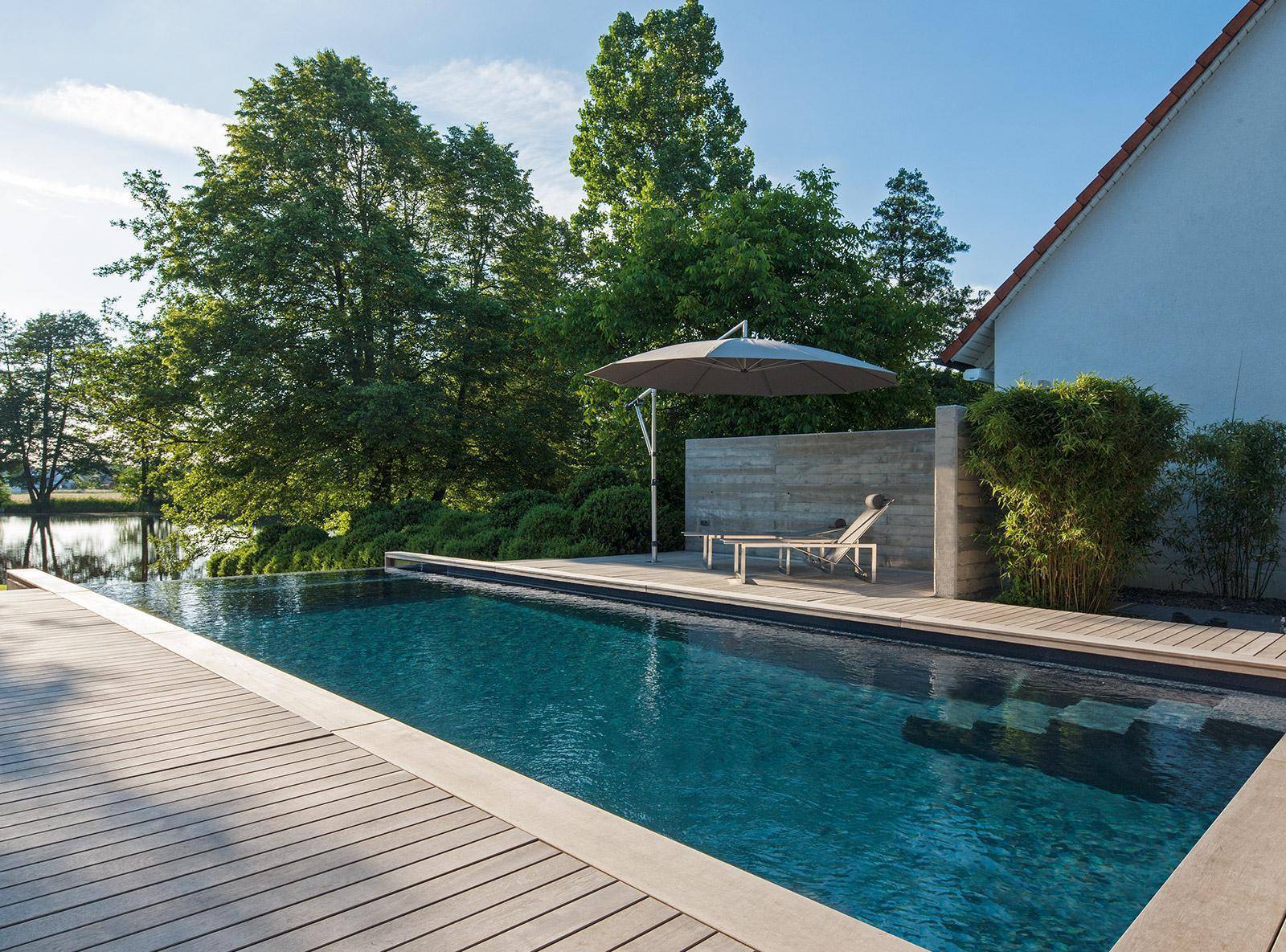 Бассейн также может быть частью открытой террасы, примыкающей к дому. Водоем как бы утапливается в деревянный настил, а вокруг него размещают зонтики от солнца, лежаки и т. п. Отдельно стоящий бассейн также можно окружить подиумом с настилом из террасной доски.