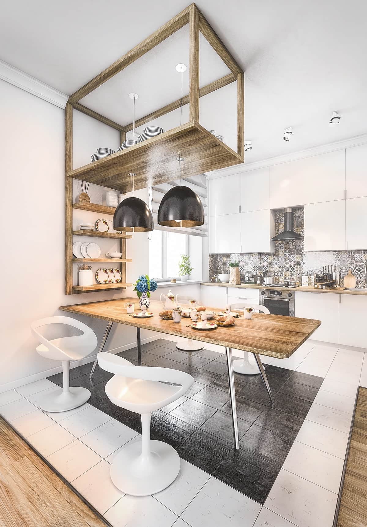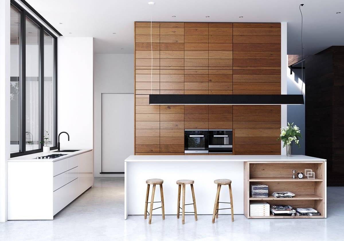 Дерево можно использовать в дизайне столешницы, пола, и даже стен (например, отделать одну их стен деревянными рейками или соорудить из них перегородку в кухне-гостиной).