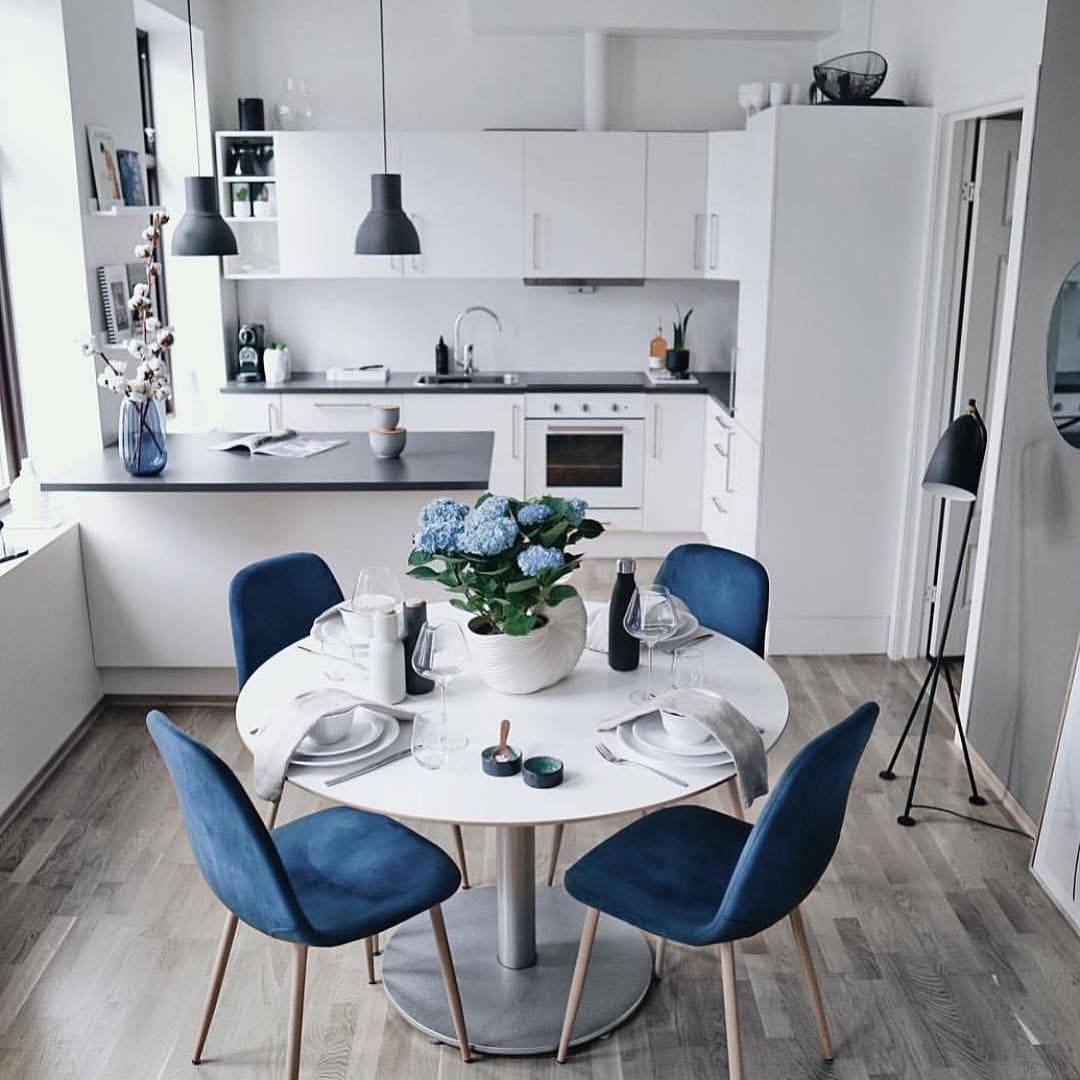 Чтобы помещение не напоминало стерильную операционную или лабораторию, к нему необходимо добавить несколько ярких цветовых оттенков. Например, украсить окна голубыми занавесками, обустроить фартук в голубых тонах, установить голубые стулья и обеденный стол.