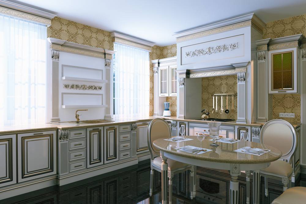 Помещение должно быть достаточно просторным и светлым. Подчеркнуть классический стиль поможет позолота и резные элементы на деревянной мебели. От пластика в отделке придется отказаться.