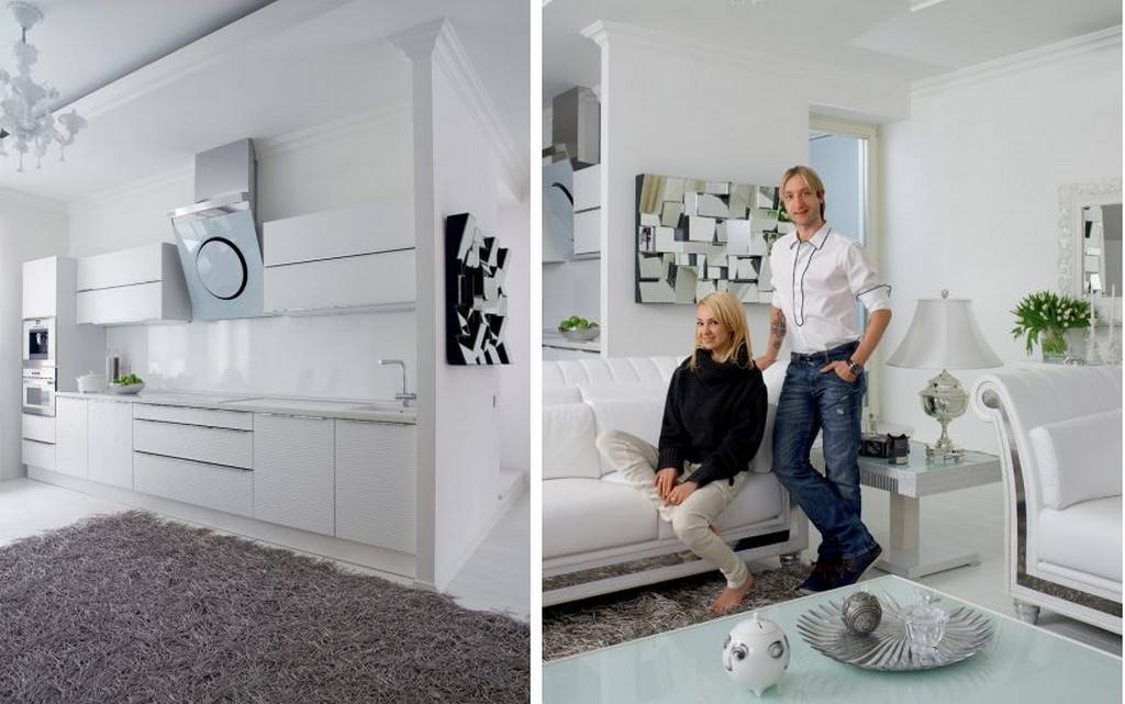 Интерьер белоснежной кухни-гостиной Яны и Евгения Плющенко. Это любимый цвет знаменитой пары. Кухня в особняке на Рублевке также выполнена в светлой цветовой гамме