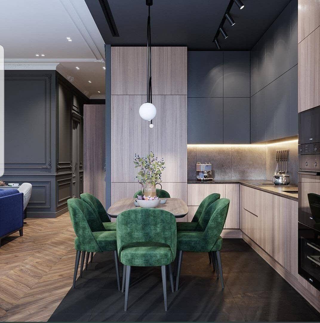 Особенно популярен дизайн кухонь темных цветов, взятых у природы: от все еще актуального матового черного и графита до необычных оттенков зеленого (например, сапфировый, серый, шалфейный или коричнево-мятный) до бордового, терракотового, тускло-красного и коричневого в сочетании с бежевым, кофе с молоком, но также темным орехом или шоколадом. Военно-морская тема на кухне также все еще популярна.