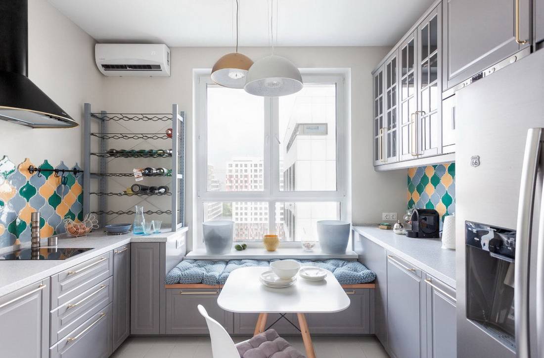 При наличии в кухне ниши ее можно использовать выгодно для создания уникального интерьера. Для отделки стен выбрать самый светлый молочный оттенок, гарнитур в цвете экрю (слоновая кость), а для фартука выбрать светло серо-бежевый тон. В результате вы получите игру теплых и холодных оттенков, которые будут создавать иллюзию, что стена находится на достаточно большом расстоянии.