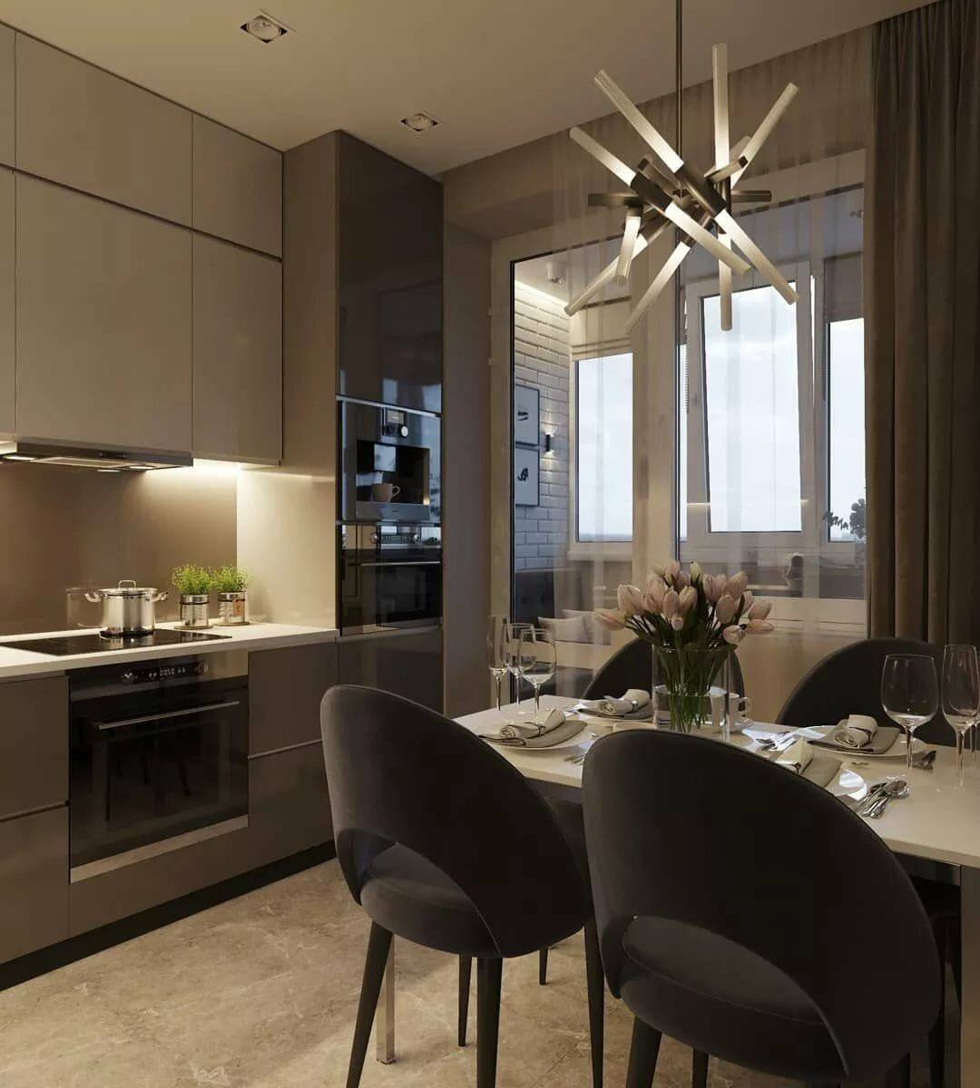 Для этого стоит отдать предпочтение простым глянцевым фасадам без лишних деталей, а под них заказать встраиваемую технику. Кухня должна смотреться монолитно.