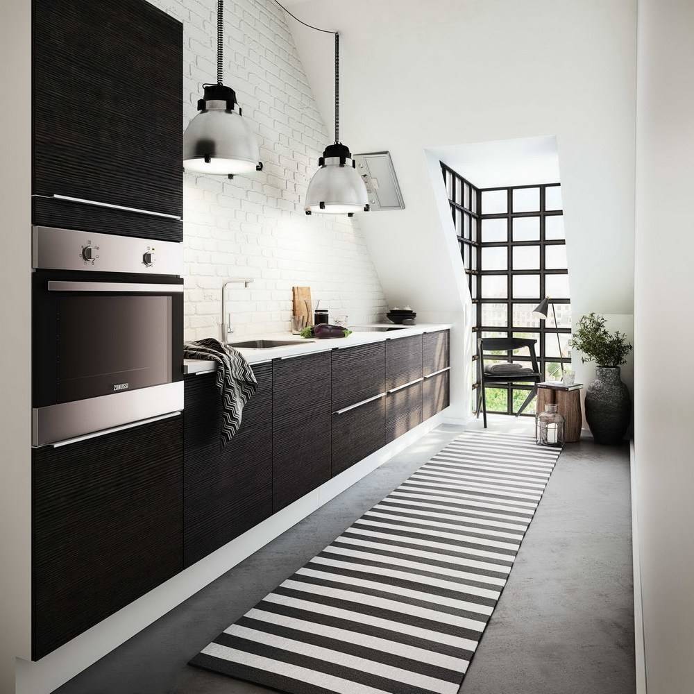 Можно создать при помощи темной столешницы из дерева, белой кухни с глянцевыми фасадами, кирпичной стеной над рабочим столом или у обеденного стола. Из декора подойдут люстры с металлическими абажурами, хромированные смесители, кактусы, стеклянная посуда.