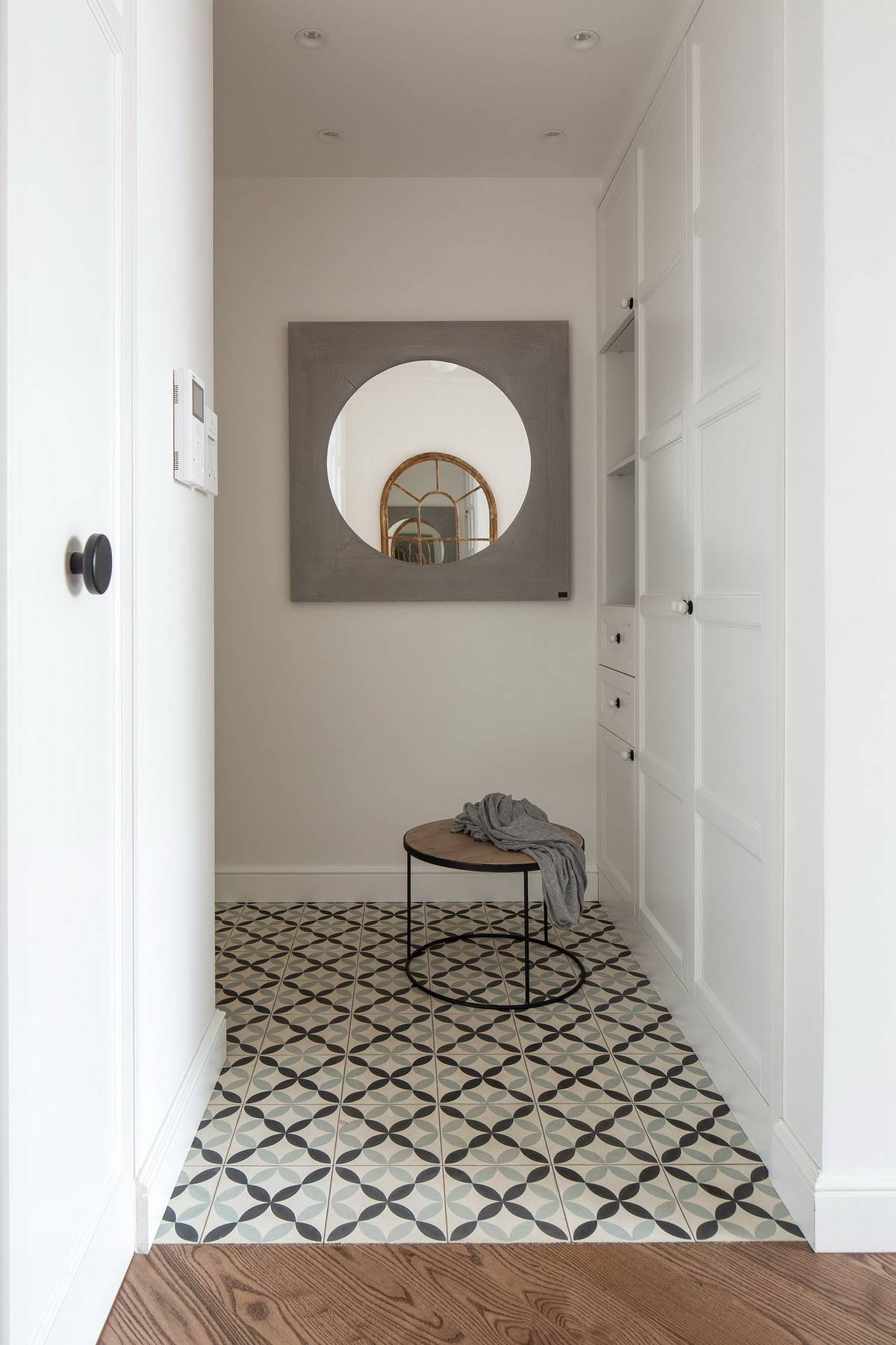 Обязательным атрибутом коридора-прихожей является зеркало. Оно может быть и частью мебели, когда встраивается в дверцы шкафа. Кроме того, что этот предмет позволяет взглянуть на себя, выходя из дома, он также зрительно расширяет коридор. С другой стороны, если входная часть квартиры совсем маленькая, есть риск случайно разбить его. Поэтому в некоторых случаях лучше установить зеркало на внутренней стороне дверцы шкафа или обойтись узкой высокой конструкцией на стене, которая позволяет осмотреть себя с ног до головы.