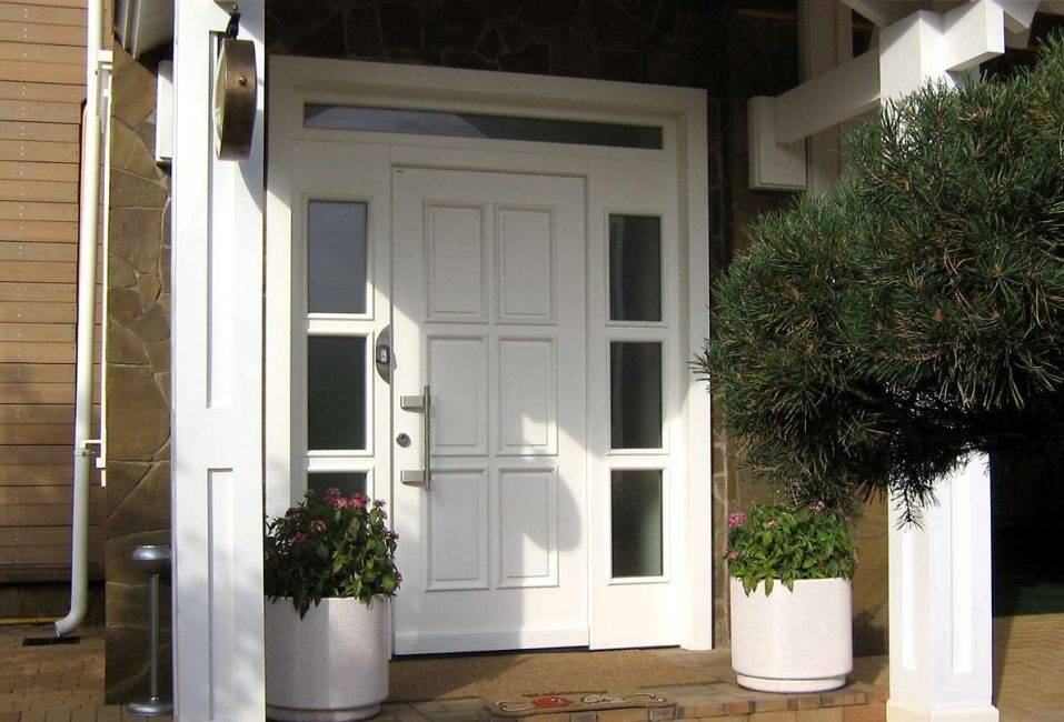 Раньше входные модели белого цвета олицетворяли общественные заведения, сегодня это красивые, парадный вход в жилой дом. Ее можно увидеть в шикарных коттеджах, а также в аккуратных частных домиках, в первом и втором варианте смотрится празднично и эстетично.