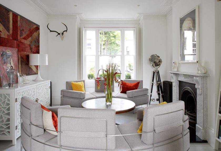 Гостиная с белыми стенами допускает любое стилистическое наполнение, начиная от классики и заканчивая ультрамодным стилем хай-тек. Плюс дизайна квартиры с белыми стенами еще и в том, что по своему желанию можно в любое время сменить настроение, просто сместив акценты, заменив части декора или текстильные вещи — занавеси, шторы, обивку, подушки, ковер и т. д.