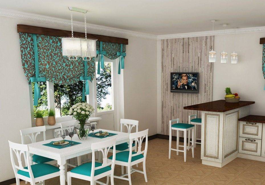 Тюль нежно-бирюзовой расцветки освежит общее пространство. Украшением могут выступать различные подвязки, оборки или необычное крепление.