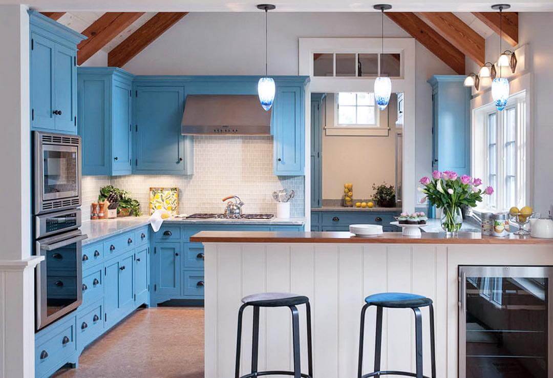 Практически в любом кухонном помещении всегда есть мебель или специальная техника. Большая ее часть размещается вдоль стен. Поэтому их лучше всего окрасить в более спокойный оттенок. Например, можно использовать моющиеся обои или просто стеклополотно, цвет которых должен подчеркнуть красоту выбранного гарнитура. В просторных помещениях стену, где находится обеденная зона, можно оклеить фотообоями, которые подойдут к выбранному стилю и цвету. Например, для лазурно-синего гарнитура отличным дополнением будет морской пейзаж на стене. В том случае, когда кухня выбрана в нежно-голубом цвете, стены можно сделать просто белоснежными.