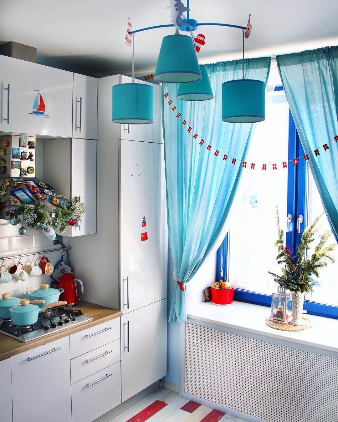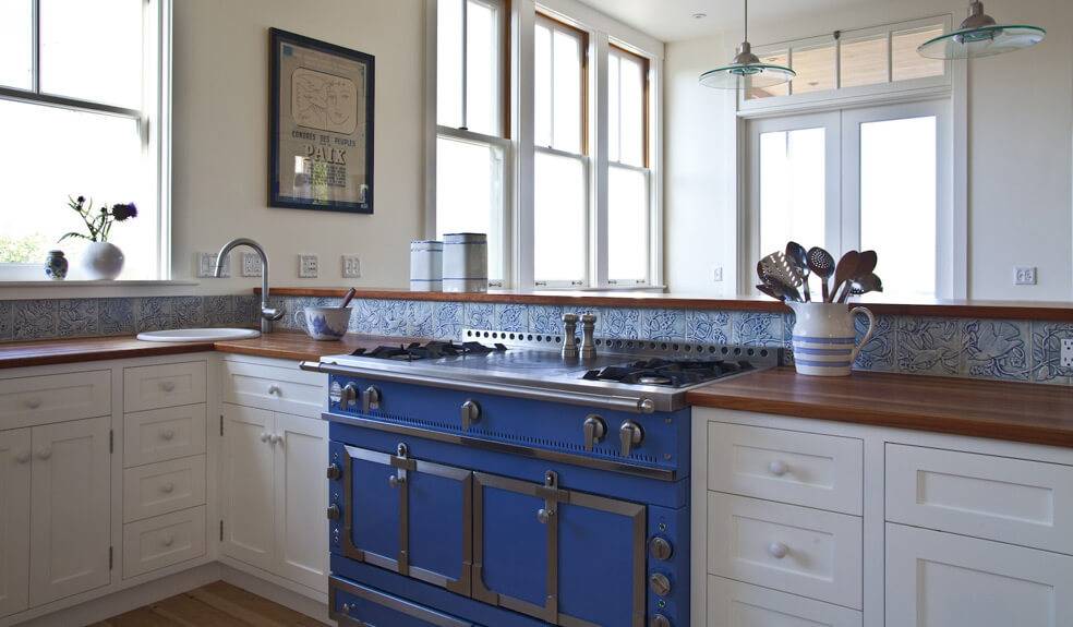 Тёмно-голубым может быть оформление кухонного фартука, занавесок, роль-ставен, бытовой техники и столов со стульями (но не все элементы одновременно).
