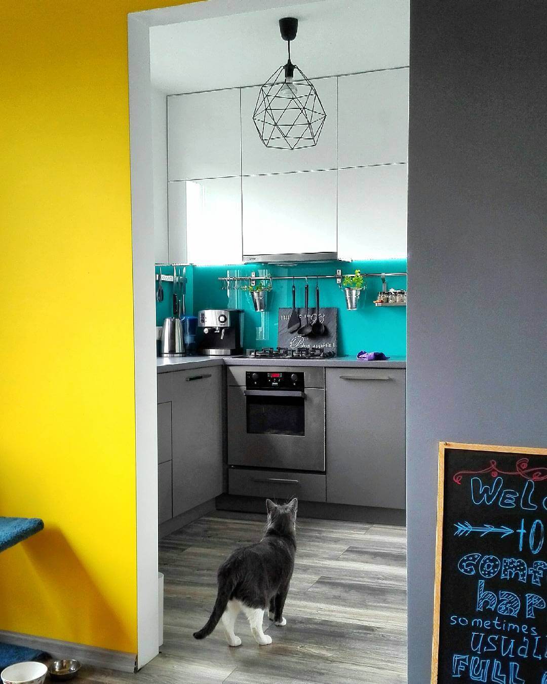 Сочетание бирюзового и серого цветов идеально смотрится на кухне, выходящей на южную, солнечную сторону.