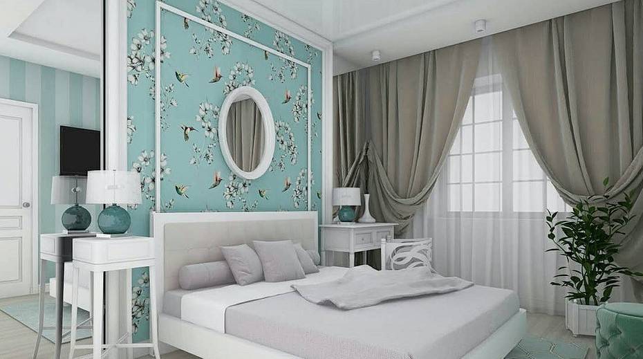 Небесно-голубой оттенок бирюзового в интерьере спальни
