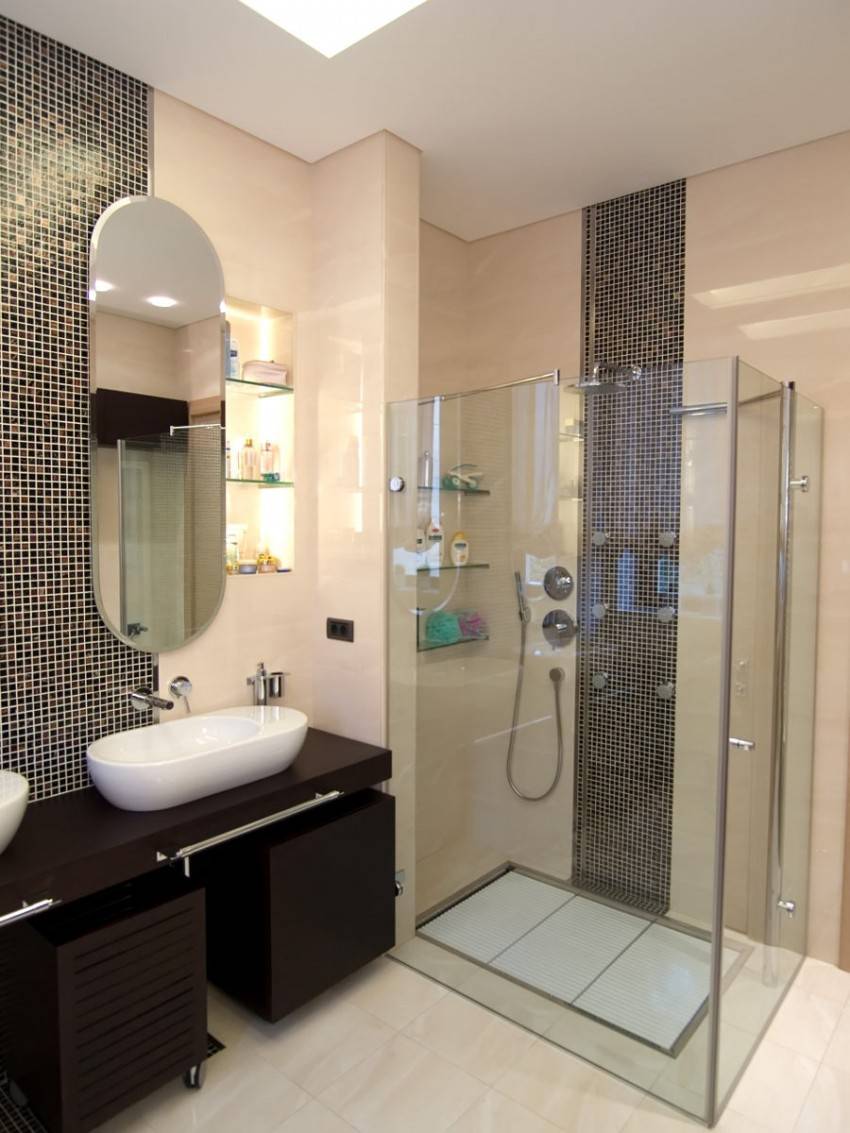 - Встроенный душ за прозрачными перегородками до потолка – для активных людей, ценящих максимальную свободу. Последние достижения в сантехнической области позволят обзавестись душевой станцией, заменяющей функционал отдельной кабины.