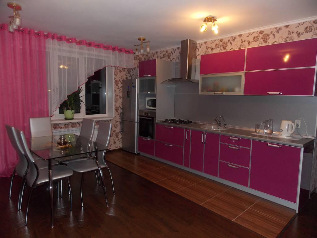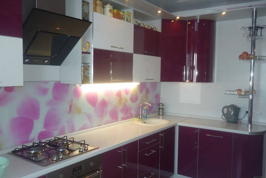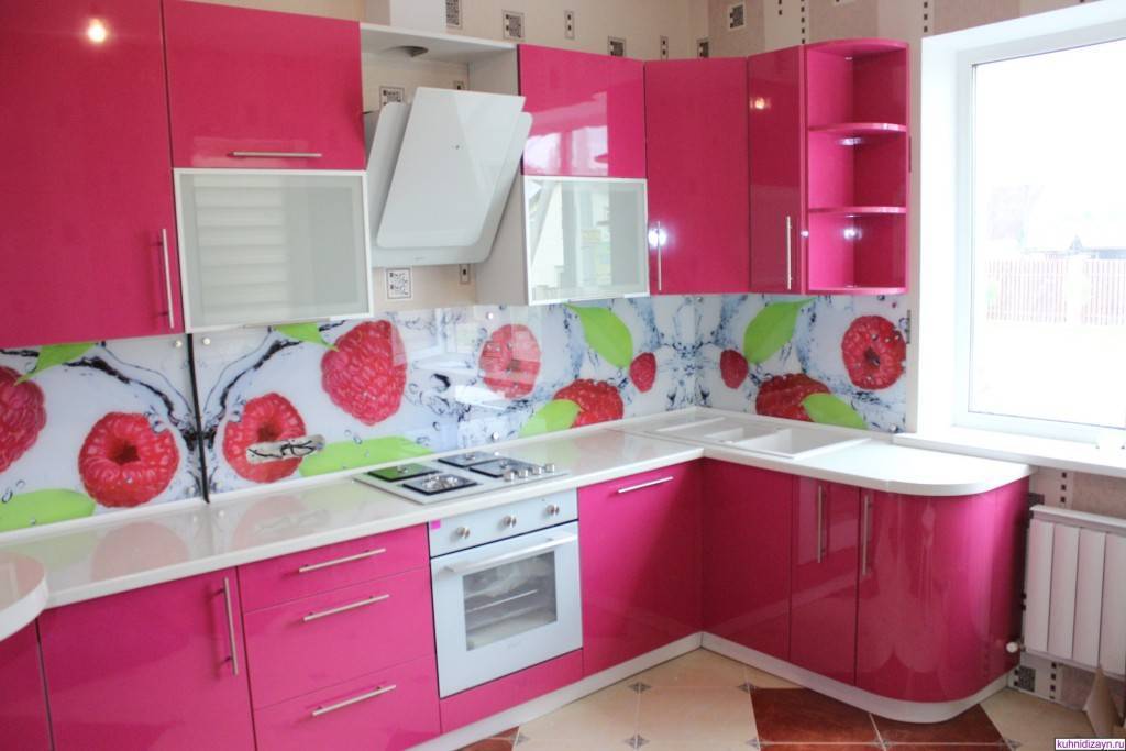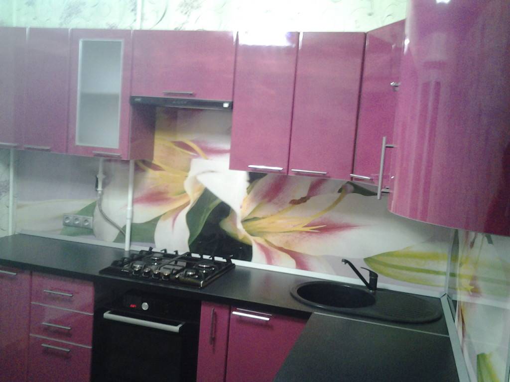 Розовый цвет отлично выглядит в глянце, используется такая фактура в обустройстве современных стилей интерьера — хай-тек и минимализм. Чтобы кухня выглядела достаточно лаконично, не следует применять более трех оттенков. Розовый глянец будет прекрасно сочетаться с черным глянцем, а также с металлическими хромированными поверхностями.