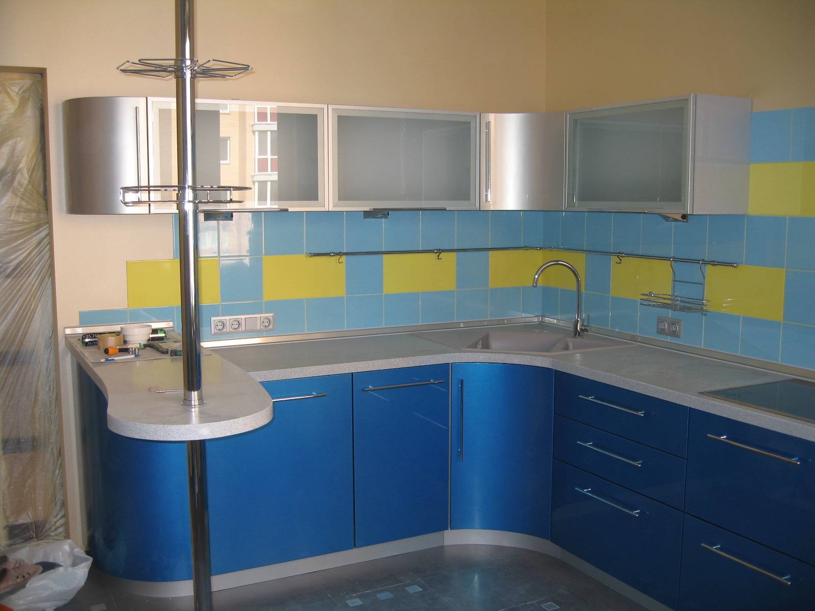 Отлично будет выглядеть мозаика, состоящая из керамических или стеклянных фрагментов в нескольких оттенках синего. Фартук синего цвета будет хорошо сочетаться с рабочей поверхностью белого, серого или черного цвета.