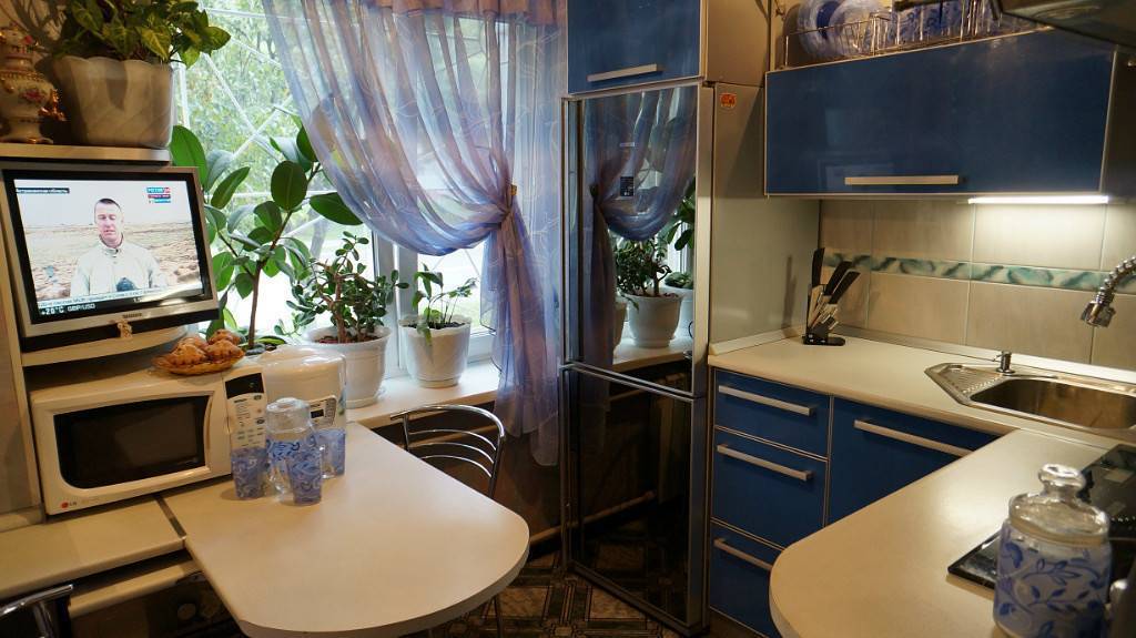 Если места совсем мало, в помещении можно установить угловой стол, либо использовать специальную раскладную столешницу, прикрепленную к широкому подоконнику. И стол, и стулья, должны быть максимально светлыми. Чтобы наполнить кухню светом и воздухом, рекомендуется использовать стеклянные и глянцевые поверхности.