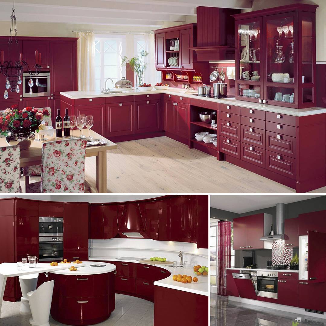 Сильные красные винные кухонные шкафы делают кухню стильной и современной